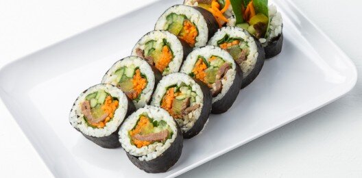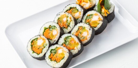 Рис, нори, морковка по-корейски, огурцы, омлет (вода, молоко, яйцо), консервированный тунец с майонезом, салат ромейн, заправка из кунжутного масла. Подается с соевым соусом