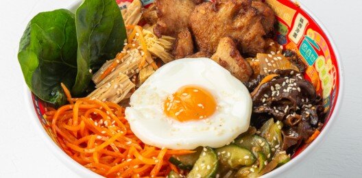 Рис, грибы тофу, салат из древесных грибов муэр, морковь по-корейски, маринованные огурцы, говядина, капуста кимчи, яйцо, кунжут, салат ромейн