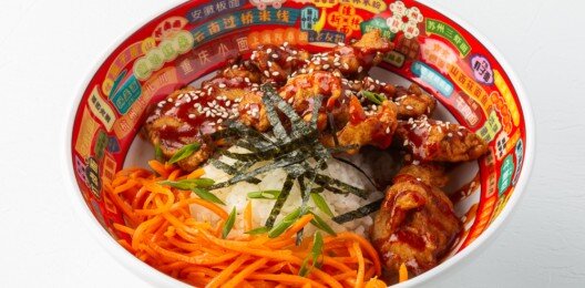Маринованное куриное филе, красный лук, болгарский перец, пшеничная лапша, сладко-острый соус, морковь по-корейски, салат ромейн, зеленый лук