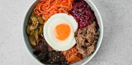 Рис, тофу, свёкла-ча, огурцы-ча, морковь по-корейски, грибы моэр, капуста кимчи, салат романо, яйцо, фирменная заправка, кунжут