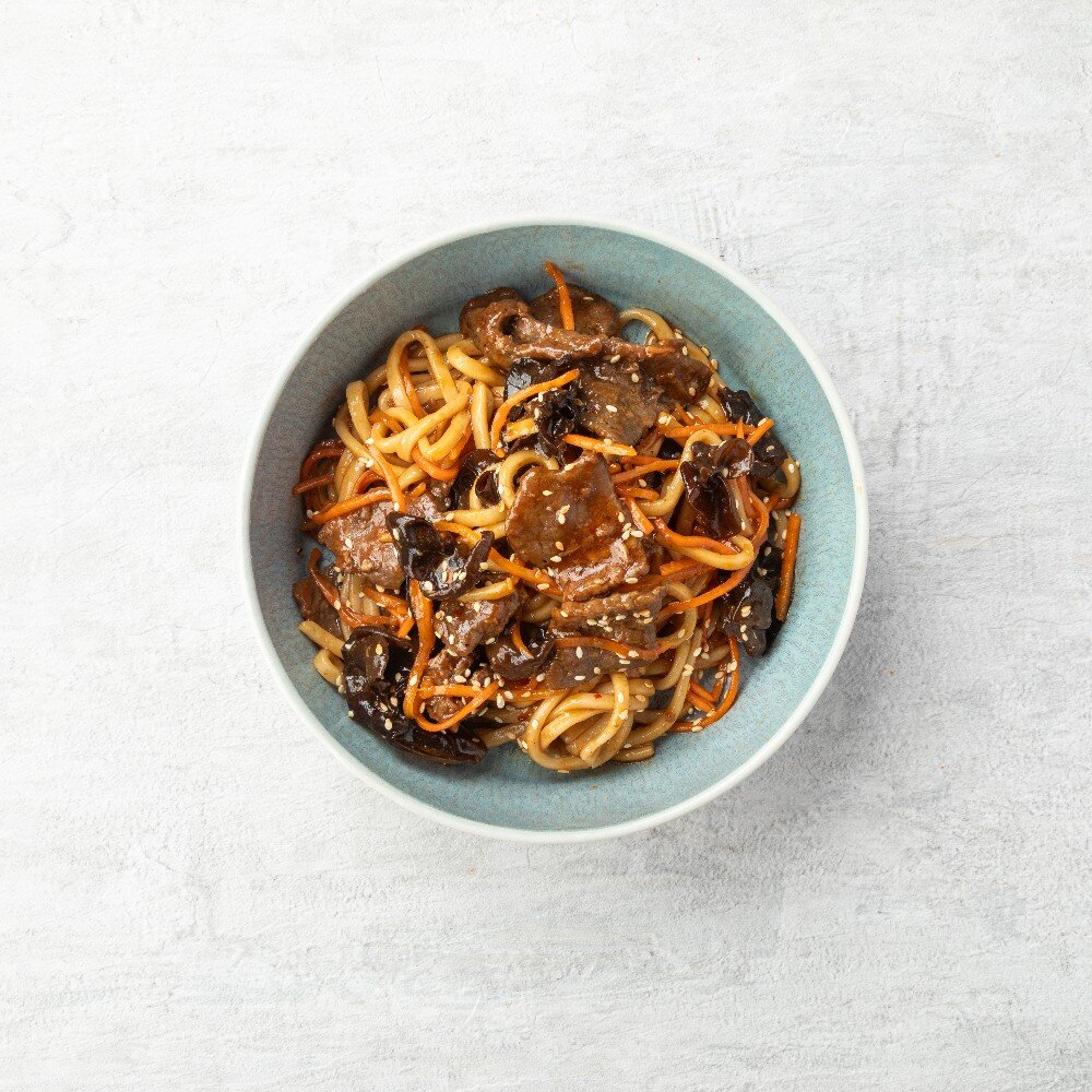 Лапша удон, маринованная говядина, морковь по-корейски, грибы моэр, устричный соус, лук зеленый, кунжут