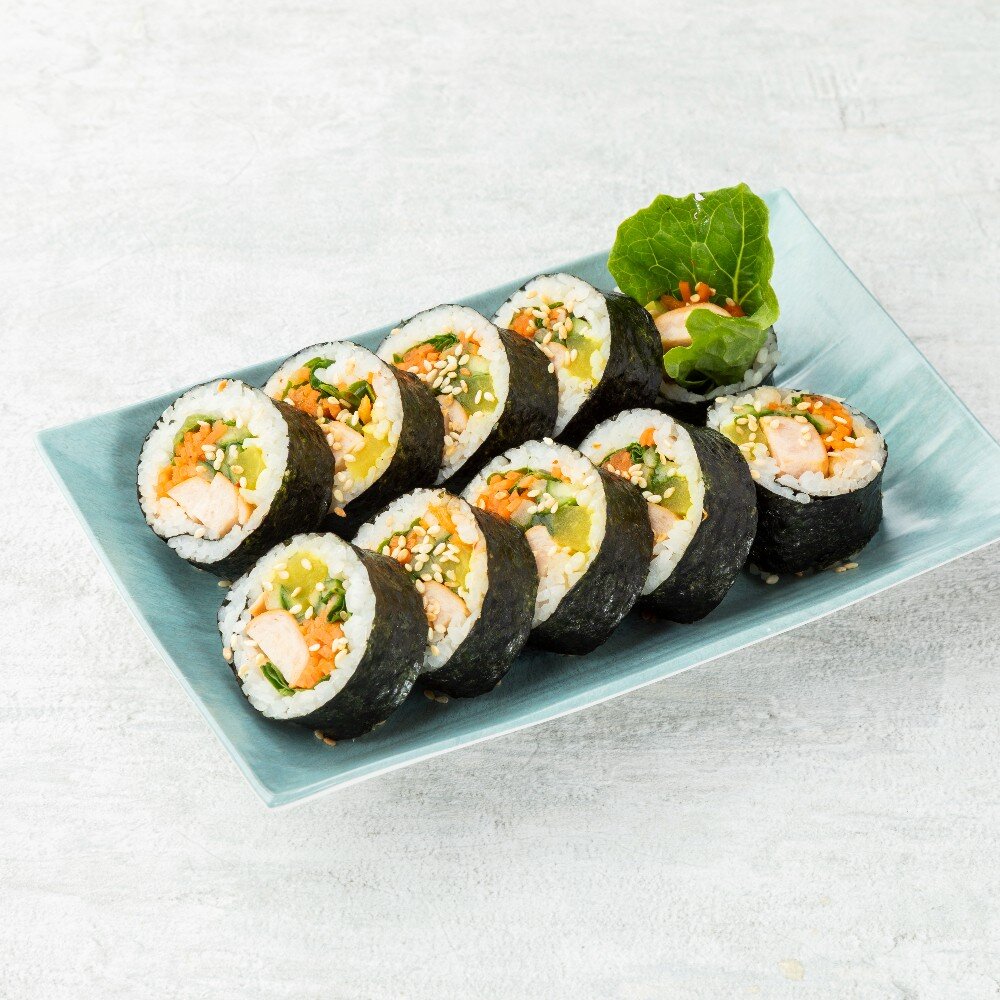 Рис, сосиска, морковь по-корейски, свежий огурец, дайкон маринованный, омлет, салат романо, кунжут, нори