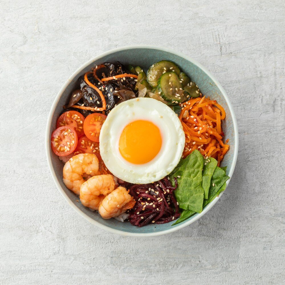 Рис, тигровые креветки, свёкла-ча, морковь по-корейски, огурцы-ча, грибы моэр, помидоры черри, салат романо, яйцо, фирменная заправка, кунжут