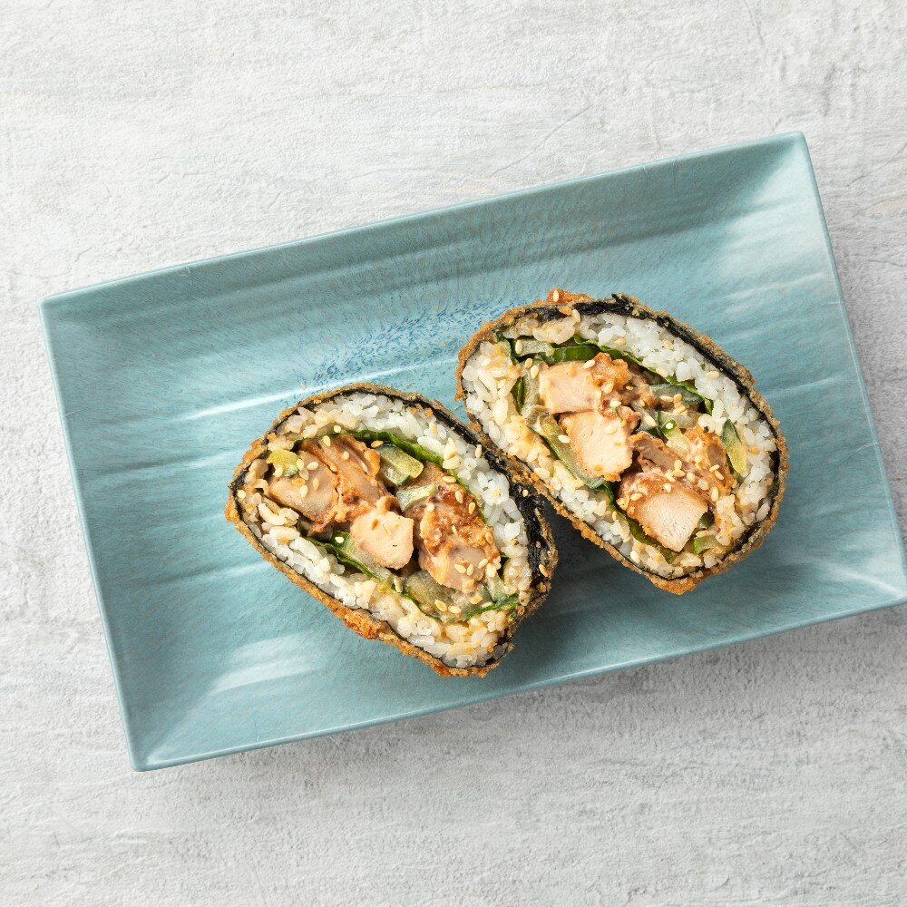Водоросли нори, рис отварной, салат ромейн, салат огурцы- ча, куриная грудка, яйцо, мука темпурная, сухари панировочные, соус