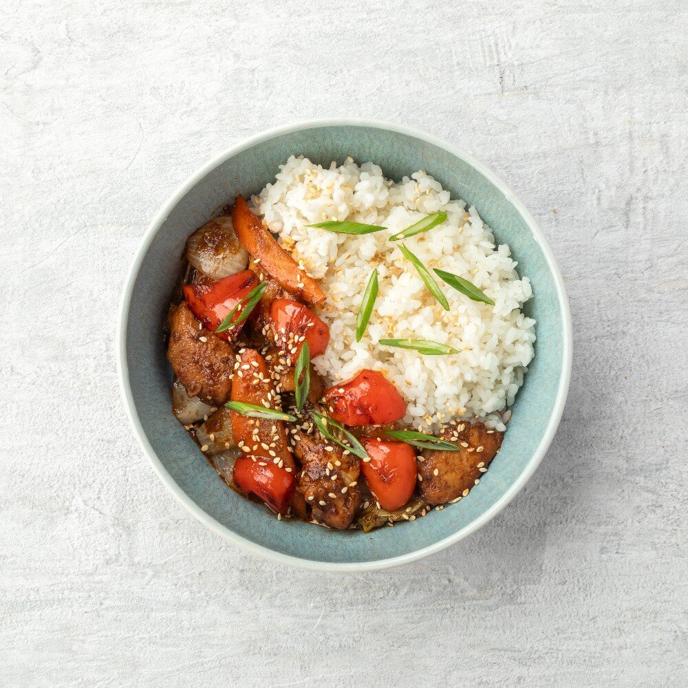 Жареное куриное филе с овощами в острой корейской пасте кочудян, подается с рисом