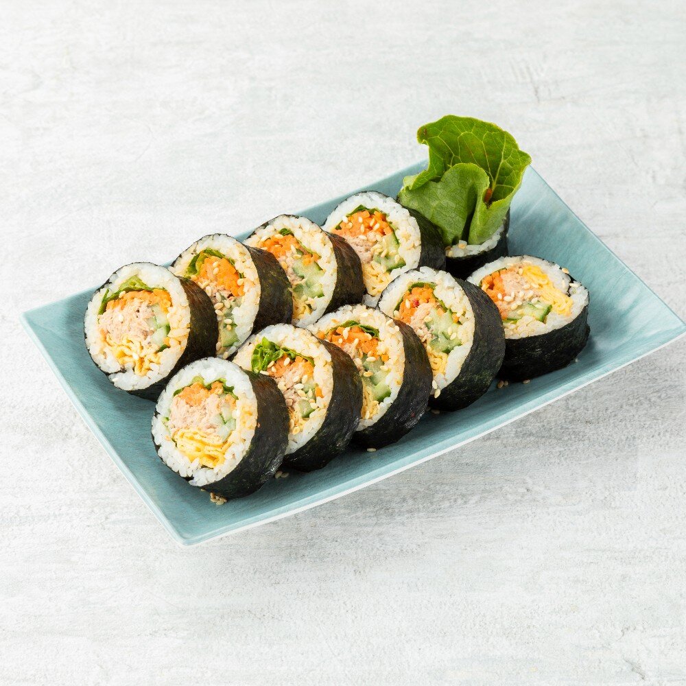 Рис, нори, морковка по-корейски, огурцы, омлет (вода, молоко, яйцо), консервированный тунец с майонезом, салат ромейн, заправка из кунжутного масла. Подается с соевым соусом
